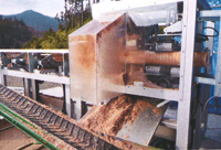 木材ストック ↓ 分離 ↓ 螺旋送り ↓ 表皮剥ぎ ↓ 排出 ↓ 中間搬送部 ↓ (チッパーへ)