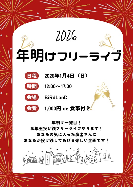 - 1/4(日) 2026 年明けフリーライブ 12:00~17:00 1,000円(カレー付き) 500円以上の相互投げ銭ライブ