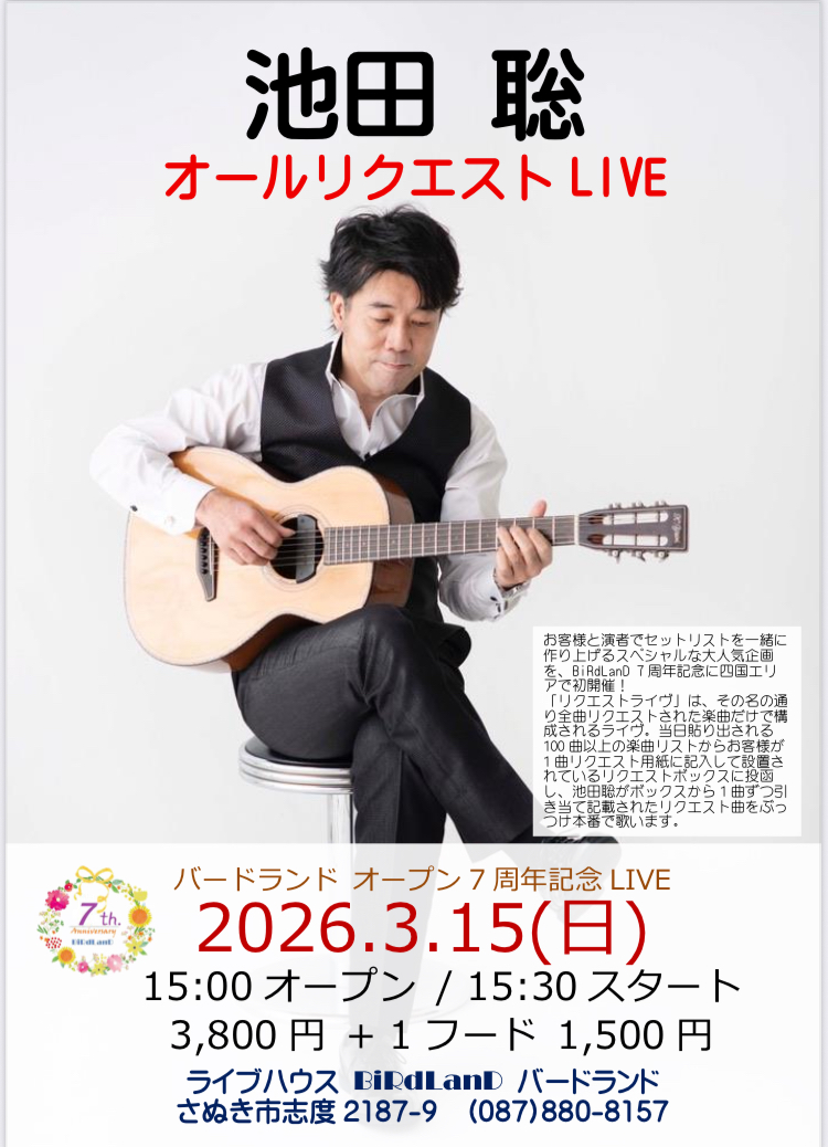 - 3/15(日) 池田 聡 バードランド7周年コラボ企画 オールリクエストLIVE 15:00オープン/15:30スタート 3,800円+1,500円(1フード)