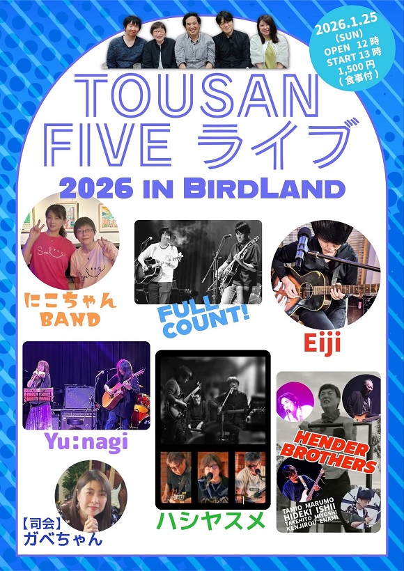 - 1/25(日) TOUSAN FIVE ライブ 2026 12:00オープン/13:00スタート 1,500円(食事付き)