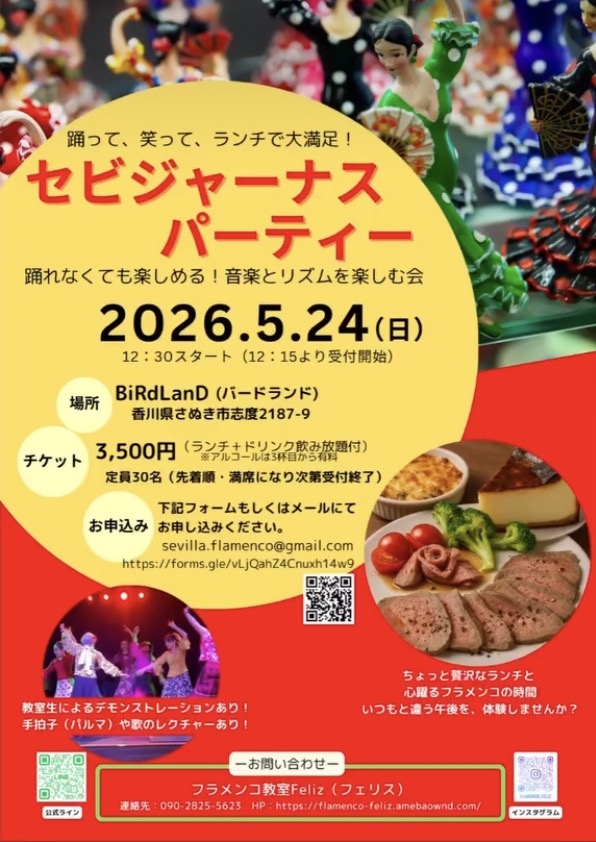 - 5/24(日) セビジャーナスパーティー 12:30スタート 3,500円(ランチ・フリードリンク付き)