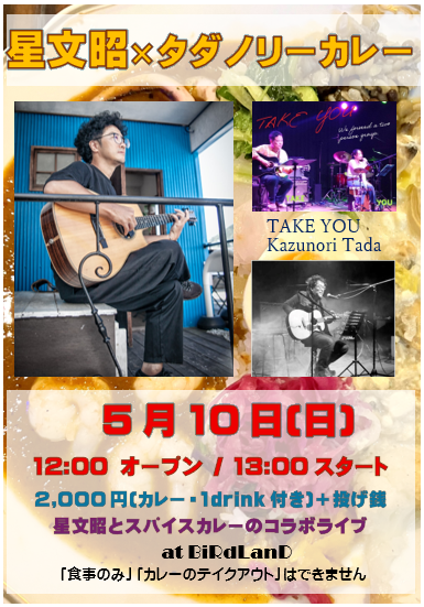 - 5/10(日) 星文昭 ×タダノリーカレー コラボLIVE 12:00オープン/13:00スタート 2,000円(タダノリーカレー、ワンドリンク付き) 投げ銭ライブです