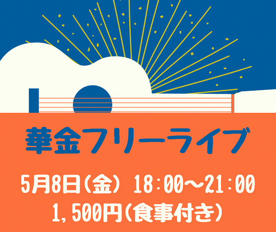 - 5/8(金) 華金フリーライブ 18:00~21:00 1,500円(カツカレー付き) 3曲まわし、エントリー不要