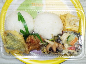 【お弁当給食】 おにぎり・茄子の天ぷら・白身魚のフライ・野菜炒め・唐揚げ |