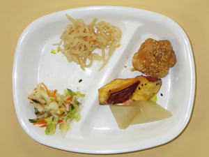 【惣菜給食】 甘辛唐揚げ・切り干し大根の煮物・キャベツのサラダ・大根の甘辛煮・大学芋 |