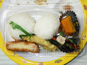 【お弁当給食】 おにぎり・コロッケ・ホオタレの天ぷら・野菜炒め・かぼちゃ煮付 |