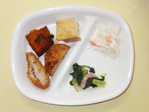 【惣菜給食】 豆腐きのこハンバーグ・切干大根の煮物・さつまいもの天ぷら・だし巻き卵・春雨サラダ |
