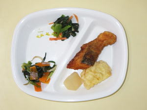 【惣菜給食】 シュンユイ(鮭)・さつまい芋の天ぷら・ニラともやしの炒め物・大根の甘辛煮・小松菜のお浸し |