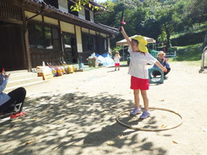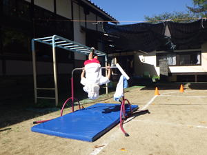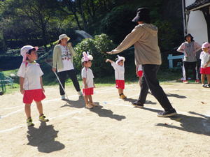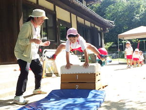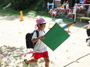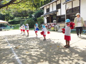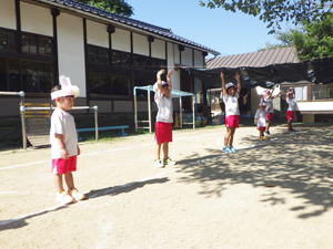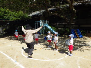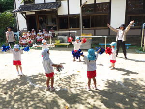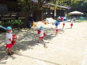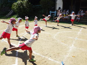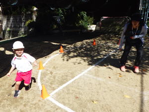 9月30日 もも組 ももさんは個人種目の練習をしているところ。 今年のテーマを『忍者』で揃えて来た実祐先生。 トータルコーディネートを意識してか 忍たまの『勇気100%・ダンス』に続いてこちらも 忍者になってのフィジカルトレーニングを体現しているよう。 そうは言ってもついこの間まで のんびり・まったり君そろいだったこの子達。 毎朝『身支度、急いで』と言っても馬耳東風。 「なんで急がなくっちゃいけないの?」 ってそんな感じだったこの子達が、 先生の投げ掛けに背中を押され 走っているではありませんか。 「運動会でしょ、あたりまえじゃないの」 と思われる方々にとっては 当たり前に見えるかもしれませんが、 去年からこの子達を見ている僕からしてみれば 感動モノの光景なのです。 どうやってこの子達をその気にさせたのか分かりませんが、 「実祐先生とこの子達の化学反応は、 こんなところまで進んで来たんだね」 と嬉しく見つめた僕だったのでありました。 走るのが早くなった子、 連続ケンパで足腰の強さを顕している子、 そしてなにより「ヤダ、やらん!」 って子がひとりもいないこの情景に ひとり感極まっていた僕でありました。 実祐先生とイメージを共有して 忍者に成り切ることで『その気』になれたこの子達。 時代考証・文化考証の上で気になるところはありますが、 それよりもこの子達の『その気』を醸成する設定が どれほど大切であるかを言うことを 感じさせてくれているこのクラス。 もも組の子ども達、 この半年の歩みの中で 確かなる心身の成長を 嬉しく感じさせてくれています。 運動会本番では 皆さんがご自身の目と感性をもって それを見つけてくださったなら、 それがなにより嬉しいことと思います。 |