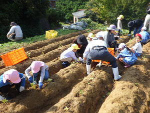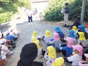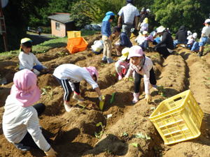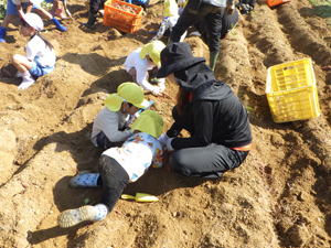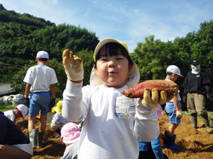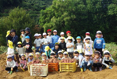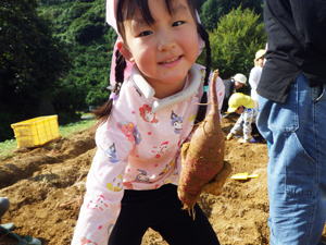 【今週のスナップ 10月2日】 今日はすみれ・もも組の子ども達が公民館のおいもほりに参加。 日土公民館とスタッフの皆さんにお世話いただき、 小学校・保育所と一緒においもほりをさせてもらいました。 いも苗植えの時は雨降りで 全部公民館の皆さんにお願いしてしまったので、 今回みんなで顔を合わせるのは初めて。 日土の子が少ない幼稚園ですが、 それでもスポ小とか保育所経験のある子達は 見知った顔を見つけて嬉しそうにしておりました。 公民館長さんのご挨拶から始まったおいもほり。 「今年は暑く雨も少なく おいもはどうなっているでしょう? 掘ってみたらおいもの機嫌が分かるでしょう」 とそんな言葉を受けまして 勇み畑に上がった子ども達。 おいもの機嫌はよく分かりませんが 畑はカチカチの難攻不落。 なかなか掘れないおいもさんに 諦めモードの子ども達でありました。 それでも周りの大人に助けられ、 掘ってゆけば地中深くにたくましいおいもを発見。 やはり今年は暑く雨も少なかったので 下に下に涼と水を求めて伸びて行ったのでしょう。 いつものようなおっとりとした デブいもちゃんはあまり居ませんでしたが、 それでもすらっとしゃきっとマッチョなおいもが あっちこっちで掘り上げられておりました。 こう言うおいもは掘るのがホントに難しい。 細く下に伸びているおいもの周りを 『指先ドリル』でぐりんぐりんと掘ってゆきます。 僕らも手を添え周りを掘って行ったなら、 ちょっとずつおいもがグラグラし始めます。 すみれさんは歯の生え変わりの時期となり 「歯がグラグラする!」って言う子が数人あって、 それになぞらえ 「おいももグラグラ。 ○○ちゃんの歯みたいにもうすぐ抜けるぞ! がんばれ!」 と励ますと、 もいちど『やる気スイッチ』に火が入った子ども達。 そうやりながらなんとかかんとか おいもほりを遂行したこの子達でありました。 そんなこんなで手こずって 気が付けば一時間経過のもう10時。 保育所のお迎えバスもやって来て、 最後は急いでみんなで記念写真を撮りまして 「またね!」「ありがとうございました」 「今度はおまつりパレードでね!」 とお別れをしたのでありました。 そうして幼稚園に帰って来た子ども達。 後から園に届けていただいたおいもさんを 「これ、わたしがほったやつ!」 と嬉しそうに持って帰ってゆきました。 本日も一杯一杯お世話くださった公民館の皆さん、 そして日土の皆さん。 本当にありがとうございました。 中には幼稚園卒園生のお母さんの顔もあって 嬉しい再会の時となりました。 また幼稚園にも遊びに来てください。 |