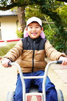 | もも組のさくちゃん、 三輪車に乗って御機嫌笑顔。 カメラを見つけるとこんな近くに どんどんどんどん寄って来て、 お茶目パフォーマンスで大サービス。 でも最近はそればかりでなく色々な物事に 自分からがんばって取り組んでいます。 素敵なお兄ちゃんになりました。 |