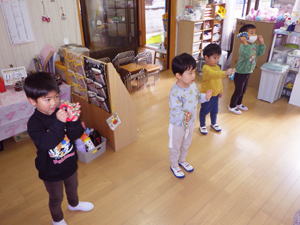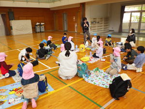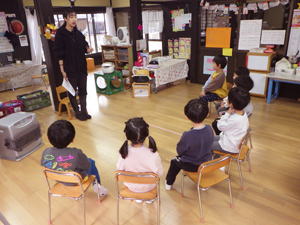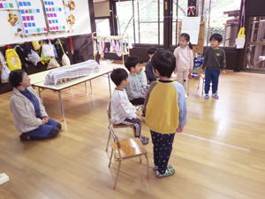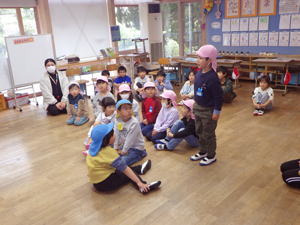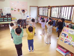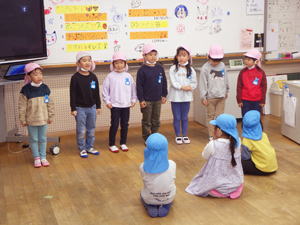 | 【11月19日 お誕生会】 今日は11月生まれさんのお誕生会が行なわれ、 二人の女の子のお誕生日をみんなでお祝いすることが出来ました。 この幼稚園で一番ベテランのかえちゃんと 一番新人さんのきょうちゃんが今日の主役。 いつも前ばかり見て突き進んでゆく いのしし年のかえちゃんですが、 自分も入った時はこんなだったことを思い出していたでしょうか。 優しく見守るそのまなざしがいつもの『せかせかかえちゃん』と違う様を 感じさせてくれた『お誕生日さんインタビューコーナー』でありました。 今月の担当は実祐先生。 今回のお楽しみはパネルシアターで おいもほりの話を聞かせてくれました。 秋の虫・コオロギがおいもを引っ張り始めたのでありますが、 抜けないのでバッタ・赤とんぼ・どんぐりと 最後は秋の風までが引っ張って やっとのことで抜けた大きなおいも。 まだ残っていた蔓をお誕生日さんにも引っ張らせてくれると言う そんなお楽しみ演出もあったこのおいもほり。 季節のものや幼稚園の山にもある身近なものを取り入れて お話作りが出来るようになった先生の姿を 嬉しく見つめたものでありました。 さてさて、その後も実祐先生のお楽しみタイムは続きます。 投げ掛けたおいものダンスは初見にも関わらず 子ども達は大乗り気。 嬉しそうに身体を動かし おいもワールドを堪能しておりました。 最後に新聞紙を使った遊びを披露してくれた実祐先生。 『びりびりやんちゃ』を楽しんだり、 それを秋の葉っぱに見立ててはらはらふわふわ舞い上がらせたり、 色々なミッションを提示します。 でもその「説明を聞いていてね」の段階で、 聞かずにバラバラわらわらやり始め 大わらわになったホール。 そこに美香先生が助け船を出してくれまして 何とか収まった一幕もありました。 そんな危機も乗り越えて、 お母さん達にも手伝っていただき 新聞紙とカラービニール袋で作った巨大おいも。 「おー、まだおいもつながりでがんばっているんだね!」 と先生の今回の『おいもコンセプト』をやり通そうとする姿に 感銘を受けたものでありました。 でもそれで終わりではありませんでした。 最後はそのおいもを引っ張って、 子ども達においもほりを追体験させてくれた実祐先生。 あの本物の芋蔓を引っ張って みんなでがんばった幼稚園のおいもほりを 思い出してくれたでありましょう、子ども達。 また最初のパネルシアターにもつながり回帰し、 壮大なる『おいも物語』が ここに完結したのでありました。 そんながんばりチャレンジと新しいことにも挑戦した実祐先生。 突如現れた窮地を受けて助けてくれた先生達。 みんなが一つのことに向かって がんばり助け合いながらやってくれている そんな今の日土幼稚園の姿を体現してくれた 素敵なお誕生会となったような気がします。 がんばってくれた先生達、 そんな先生達の想いについて来てくれた子ども達、 そしてまた忙しい日々の中にあって今日のお誕生会に参加して 子ども達のためにあれこれして下さったお母さん達、 最後にそんな僕らのことを守り導いて下さった天の神様。 全ての人々・全てのことに心からの感謝と喜びを感じた 今日のお誕生会でありました。 みんなみんな本当にありがとうございました。 |