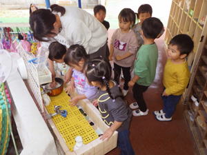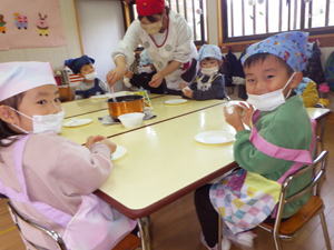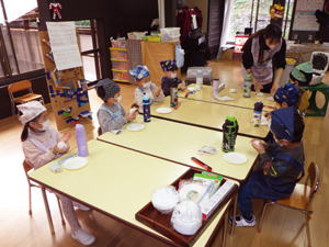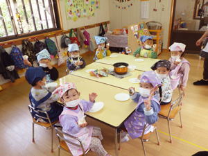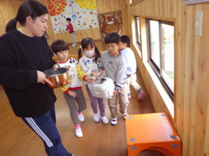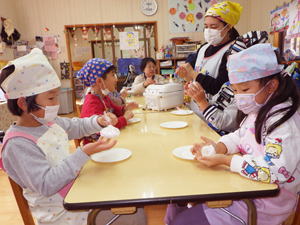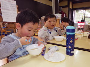 | 【今週のスナップ 11月26日】 今日はクッキングの日。 今回は自分達でおにぎりを握りました。 すみれさんと髭のおじちゃんが 一生懸命育ててくれた玄米を混ぜたお米を研ぐところから始めたこの日。 お米から白いお水が出て来て 「えー?なんでー?」って子達もありました。 一方上手に研いでみせてくれる子に 「上手ね。なんで上手なの?」 と尋ねると 「お母さんと一緒にやってるもん」 と女の子。 『日常の家事の中に身を置くことって やっぱり大事なんだな…』 と思ったものでありました。 子どもがやると失敗するわ・大変になるわ、 大わらわになることも多く お母さんが自分でやった方が早いと思うこともあるでしょう。 でも傍で見たり・出来ることをちょっとやらせたり、 そんな関りがこの子達の心を育ててゆくんだな… と思いながら見つめ聞いた 先生とこの子達の会話でありました。 そうやって一クラス一つずつ 炊飯器でお米を炊く準備をいたしまして、 「スイッチオン!」も僕らでやりました。 すみれ組ではその時「ピ!ピ!」 っと音が二回なりまして、 「えー、なんか変?大丈夫?」 と確認をしたらなんか違うことになっていて、 改めてスイッチを入れ直したもの。 電子制御の調理器がほとんどのこの時代。 操作が簡単になったからこそ 正しく操作しないと大変なことになることも。 違うボタンを押していたり、 ダブルクリックで二回押してしまったり、 失敗の元はヒューマンエラーが多いんです。 視覚・嗅覚と共に聴覚や触覚なども 大事なインフォメーションだと言うことを 改めて感じたものでありました。 さて、お米が焚き上がり、 お昼間近となりまして、 いよいよ『おにぎりタイム』となりました。 ラップの上に炊きたてのをごはんを乗せてもらいまして、 「じゃあ、握ってみよう!」と始めたなら 「あつい!」「あつい!」 と子ども達。 「じぃーっと持っていると熱いから 右手と左手で交代しながら握ったらいいよ」 と言いながら 子ども達と一緒におにぎりを作ったものでした。 そうして出来上がったおにぎりをそれぞれいただきます。 朝早く来て先生達が作ってくれた たっぷり具材入りのトン汁と一緒に食べたなら、 「おいしい!」「おいしい!」 と子ども達。 大きなおにぎりを三つも四つも食べまして ご満悦の子達もありました。 口の中に感じる歯ごたえは ちょっと入っている玄米の自己主張。 分量にしたら5%もあるかないか… と言うくらいのお手製玄米ですが、 これを脱穀するのに相当苦労したすみれさん達。 こんな手間暇のおかげで 僕らはお米を食べることが出来ているんだと言うことも 自ら感じ学んでくれたことと思います。 一年をかけて僕らの国の大切な米食文化について 学んでくれた子ども達でありました。 こうして色んなことを感じ・学びを得た 今回の『おにぎりクッキング』。 この体験を子ども達にさせるために また沢山の奉仕と尽力を下さった 先生達に感謝です。 本当にありがとうございました。 美味しかったね! |