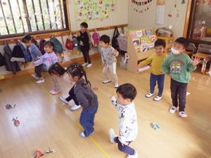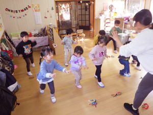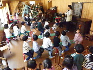 | 11月26日 ばら・たんぽぽ組 今日はダンスの練習風景。 クリスマスに向けてたんぽぽさんのダンスを みんなでやっているところ。 たんぽぽさんもばらさんも 思ったより身体が動いていて 「へーすごい!」と思ったものです。 運動会の練習が始まった頃は なかなか心と身体が重かった子達もあったのですが、 運動会での経験と嬉しかった体験が ここに来てこの子達に影響しているよう。 やっぱり『やって、出来た』の成功体験と、 「お客さんに喜んでもらえた」と言う自己肯定感が、 この子達の今のやる気の糧になってくれているようです。 歌の中に登場する色々なものになって踊るこのダンス。 子ども達もノリノリでやってくれていて、 「ゆきだるまのうたが聞こえて来る―よ」 と歌うところではゆきだるまの頭を両手で模して 「んーんークリスマス!んーんークリスマス!」 とパフォーマンス。 世の中、おしゃべりなゆきだるまが一杯いるけれど、 このゆきだるま君はしゃべらない設定のよう。 でもそんな「んーんー」が面白くって 大喜びでやっている子ども達。 素敵な選曲と上手に子ども達をリードしてくれている えりか先生の姿を見つめながら、 「みんな、がんばってるね」 と嬉しく思ったものでした。 初めての教会幼稚園でのクリスマスで 分からないことばかりだと思うのですが、 一生懸命クリスマスに向かって子ども達と歩んでくれている えりか先生に感謝です。 なにも難しいことはありません。 『クリスマスを嬉しく楽しく迎えること』が一番。 みなさんにおかれましても この子達と一緒に過ごすアドベントの日々の中あって、 小さな成長や小さな想いを受け止めながら そして共に喜び合いながら クリスマスまでの道のりを歩んで行って欲しいと願っています。 |