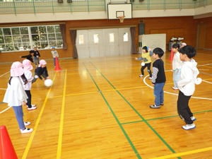 | 11月4日 すみれ・もも・ばら組 今日はサッカー教室が行なわれ、 3クラスの子ども達が元気一杯園庭を駆け回りました。 月またぎで気付かなかったのですが、 『PLUS』を入れると4週連続のサッカー教室。 でもその『続けること』の効能と、 季節が涼しく過ごしやすくなったのと、 もひとつ運動会を経て気力と体力がついて来たことによりまして、 見違えるように動けるようになったこの子達。 先週『PLUS』で初挑戦した『手つなぎ鬼改』を始めようとしたのですが、 未体験のばらさんも一緒なので「どうしよう」。 「ちょっと見ていて」とコーチに言われて 石段に座って見学をしたばらさんでありました。 すみれ・ももの子ども達は 楽しかった想いとルールが理解出来て来た自己肯定感によりまして、 嬉しそうに鬼ごっこに励んでおりました。 「じゃあやってみようか」と言われてばらさんも参加。 最初はやはり全く分からない様子だったのですが、 すみれさんが手を引きながら教えてくれたのと 『二人組でいれば大丈夫』と言うルールに助けられ なんとかやっておりました。 そのうち『ばらさん二人組』は鬼に追いかけられることもないし、 『ばら・すみれペア―』が『逃げる子』を替わってあげるその際に 『ばらさんにタッチさせてすみれが逃げる子』になると言う 考えられたファインプレーも見られるようになりまして、 ゲームとして成立させられるそんな成長と進化の姿を 見せてくれたのでありました。 この子達、なかなかやるもんです。 それに続いてコーチが始めたのは『ゴールライン・ラグビー』。 『コートの両端に引かれた線の向こうにボールを運んだら得点。 それは相手チームが取り返して自軍に運んでも良い。 相手が運んでいる途中のボールも取って良い』 と言うゲーム。 最初はそれを手で運ぶラグビー方式でやり、 ゲーム感覚を掴んでゆきます。 これはそれなりにやって出来ていた子ども達。 これまでの学習から『きっとこんなかんじ』 を分かるようになって来たのでしょう。 でも『線のこっち』と言うのがこのゲームの肝。 自陣まで運んだのに線の手前10cmでノーゴール。 言われて慌てて置き直したり…、 とそんなこんなもありながら ゲームを楽しめるようになって行った子ども達でありました。 「さて、サッカー教室と言うくらいだから…」 と平家コーチが次に提案したのは これを足でやるゲーム。 始めればこの前のゲーム実践によるルール理解があったおかげで、 スムーズに上手にやって見せるこの子達。 一つ一つ理解を重ねて行きながらやって行くことの大事さを 改めて教わった気がしたものです。 そうやりながら最後にはまた紅白試合をやったのですが、 子ども達も色々と考えながらプレーをするようになって来たみたい。 きっと加速度的に上がって来たこの子達の理解度と この秋以降ついて来た体力によってでありましょう。 きちんと良いゲームを見せてくれるようになったこの子達のことを 「へー」と思いながら見つめた僕でした。 平家コーチ、今回も楽しいレッスンありがとうございました。 この子達の成長を身近に感じられて 僕らも嬉しいです。 来週はまた『PLUS』の方でお世話になりますが どうぞよろしくお願いいたします。 |