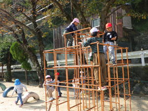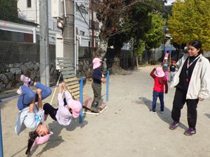 すみれ組のそうた君、 『鉄棒に座るチャレンジ』に挑戦中。 最初は恐々やっていたけど、 「隣の棒を持っていたら 回って落ちることはないからね」 のアドバイスで大成功。 素敵な笑顔で笑ってくれました。 自信を糧にまたひとつ大きくなりました。 |