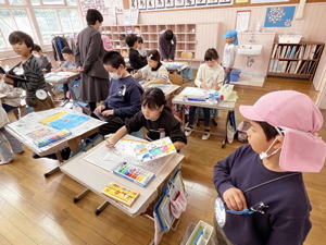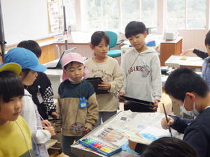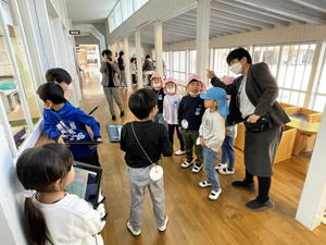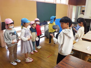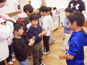 | 11月25日 すみれ組 今日すみれさんは幼保小の交流行事で 日土小学校に行って来ました。 1、2年生が出迎えてくれて始まった交流遠足。 保育所の子達も合流し、 今回は一緒に交流してくれる1、2年生の教室からのスタートとなりました。 教室のホワイトボードに本日のプログラムと 『歓迎寄せ書き』が書かれていまして、 小学生の熱量が伝わって来ます。 幼稚園では下の子達をお世話する立場のすみれさん。 でもここでは小学生が優しく教え導いてくれまして、 最初の緊張がそれでちょっと和らいだような気がしたものです。 その後お互いに自己紹介をし合いまして、 もひとつ心の距離を縮めた子ども達。 『すきなもの』の紹介で「わたしも!」とそんな共感が 仲間意識を高めてくれたようでありました。 二班に分かれて『学校探検』に出かけた子ども達。 タブレットに原稿をしたため、 各所で説明をしてくれた小学生。 タブレットを使いこなしているところもすごいですが、 高学年にならないと使わないまだ自分達も使っていない教室のことも 一生懸命下調べして臨んでくれたよう。 理科室にあった天体望遠鏡を「買いたて」と説明してくれたのですが、 ラベルには『平成26年購入』と表記あり。 「なんで買いたて?」と尋ねると 「2026年に買いました」と教えてくれた小学生。 学校の先生は笑っていましたが、 自分達なりに一生懸命調べて・考えてしてくれていたことが伝わって来て 「がんばったね!」と嬉しくなってしまった僕でした。 また上級生のお勉強の様子も見せてもらったのですが、 一杯いる幼稚園の卒園生達の今の姿を 嬉しく見つめて来たものでありました。 みんなみんながんばっておりました。 教室に戻って来て『おまけのお楽しみ』と言うことで、 ピアニカと歌の披露をしてくれた小学生。 担当を変えながら何度も何度も聞かせてくれて 僕らを楽しませてくれました。 それに続いて『なかよしあそび』として 自分達で作ったおもちゃで遊ぶ『オモチャランド』で 子ども達ををもてなしてくれました。 そこでは『遊び方』から教えてくれまして、 最後にはこれまた『お手製メダル』のプレゼントなんかもあり、 大サービスの『なかよしあそびタイム』でありました。 今年は本当に盛り沢山のプログラムで 迎えてくれた小学校。 その後、体育館に移動して 『ころがしドッヂ』で遊んでくれました。 学校探検でお勉強し、 音楽の披露で心震わせ、 『ころがしドッヂ』で一緒に身体を動かした子ども達。 『小学校』と言うものを頭と心と体をもって一杯に感じ、 入学に向けての期待や希望を 大きく大きく膨らませてくれました。 お弁当も一緒に食べたのですが、 「こっちに来て一緒に食べよう!」って誘ってくれたお兄ちゃん・お姉ちゃん。 外や『初めての人』があまり得意でないこの子達も おかげさまですっかり心を赦した様で、 お弁当の後は体育館を一緒になって走り回っておりました。 さらにその後、校庭に出ての自由遊び。 時間は押していたのですが、 「大丈夫ですか?」と心配して下さりながらも 時間延長でもてなして下さった小学校の先生達。 広い校庭や大きな遊具で これまた一杯遊んで来た子ども達でありました。 最後に『感想発表会』も行われ、 小学生のお手本に続いて幼稚園や保育所の子達も 自分の言葉で今日の感想を伝えてくれました。 それで終わりかと思いきや、 お土産に『松ぼっくりで作った飾り』まで 一人一人にプレゼントしてくれた小学生。 さよならとなっても名残惜しそうに 僕らのことを見送ってくれたのが心に残っています。 ぼくらも「ありがとうございました」と 心を合わせてお礼を言って来たものでした。 本日は一杯一杯お世話になりました、小学校の皆さん。 本当にありがとうございました。 校長先生も度々参加して下さり、 他の先生方もお仕事中にも拘わらず 快く受け答えもして下さり本当に感謝でありました。 来年、日土小学校に上がるのはいとちゃん一人ですが、 市内の小学校で事あるごとに行なわれる 交流会や合同プログラムで他の子達も またお目にかかれることと思います。 そんな時にお互いに覚えていたら素敵なことと思います。 そして6年経ったらみんな保内中学で再合流。 その日のことを楽しみにしながら 小学校での生活を楽しみながら、 これからの日々を過ごして行ってくれたらいいなと思います。 今日は本当にありがとうございました。 また、会おうね! |