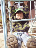 たんぽぽさんのきっぺい君、 ジャングルジムで遊んでいます。 何気ないこの仕草、でも実は 『腕でぶら下がって&足を上げて』 と言うスゴミッション。 腹筋・腕力共にないと出来ない マッチョ仕様の技なのです。 サッカー教室が楽しみです。 |
