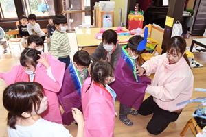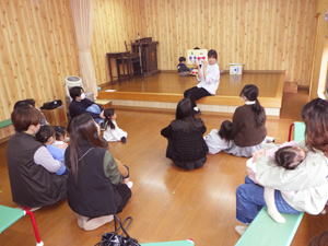 | 【3月2日 ひよこクラブ&たんぽぽ組】 今日は今年度最後のひよこクラブ。 7名のひよこちゃんと4名のたんぽぽさんが参加して、 賑やかに『ひなまつり』をお祝いいたしました。 今月の担当はえりか先生。 やっぱり導入の手遊び・触れ合い遊びはとっても上手。 ちょっとお緊張気味で場に慣れない小さな子達も、 ちょっとほっとのふれあいあそび。 そこからいつもの調子が出て来まして、 『元気モード』に入って行った子ども達でありました。 今月は『面白ひなまつり』を 紙芝居で見せてくれたえりか先生。 『ねずみ君達が作ったおひなさまは かわいいたまごのおひな様。 さてさてそれがどうなるでしょう?』 とそんなお話に興味津々の子ども達。 お母さんの膝に抱かれつつ、 静かに見入っておりました。 さあ、今回の製作は これまたかわいいおひな様。 お母さんと一緒に作れたならば、 先生お手製の『記念写真パネル』の前で 「はい、チーズ!」。 素敵な『ひなまつりの思い出の一枚』が撮れました。 可愛いパネルの前での『思い出スナップ』。 お母さん達はスマホに残したくって仕方ないのですが ひよこちゃん達は「イヤイヤ!」で、 ちっともじっとしていてくれません。 でもたんぽぽさん達の番になりますと、 可愛い笑顔を添えての『はい、チーズ!』。 幼稚園で写真慣れしているのもありますが、 それ以上に『見てもらえことの喜び』や 『お母さんが嬉しそうな顔をしてくれることの喜び』を 分かってくれるようになったのでしょう。 クリスマス・発表会と みんなの前でがんばって来たもんね。 そんなこの子達の成長を感じることの出来た 嬉しい情景でありました。 そう、今年度最後のひよこクラブ。 一年経つと、幼稚園で数か月を過ごして来ると、 こんなにも色々なことを受け入れられるようになるんだね! と言う嬉しい姿を見せてくれたこの子達。 来年度も素敵なドラマが待っていることでしょう。 どうぞまたみなさんで、 ひよこクラブに遊びに来てください。 この一年通って来てくださった皆さんに、 そして毎月のひよこクラブを企画・プロデュースしてくれた先生達に、 心より感謝です。 みなさん本当にありがとうございました。 おかげさまで素敵なひよこクラブが出来ました。 僕も毎月楽しかったです。 |