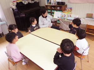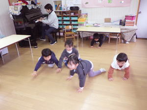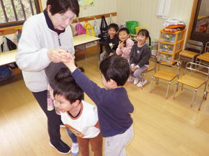 | 3月2日 ばら組 今月のひよこクラブはえりか先生が担当してくれたので、 ばらさん達は潤子先生と過ごしています。 最初は眞美先生と過ごすはずだったのですが、 「わたし、やろうか?」と潤子先生。 もう歳だの何だの言っている今日この頃ですが、 こう言うものまだまだやりたい想いが伝わって来ます。 「この想いと子ども達との関わり合いが、 なによりの元気の源なんだよね…」 と思いながら見つめた情景でありました。 子ども達に絵本の読み聞かせをするところから始めた潤子先生。 意外にもちゃんと聞いているこの子達に 僕が驚いてしてしまいました。 ちょっと前までは『長い絵本』『ストーリー物』は もたないと聞いていたこの子達。 それが潤子先生の言葉をしっかり受け止め、 聞いているではありませんか。 こんなところにもこの子達の成長を感じたものでありました。 それに続いて潤子先生十八番の『リズム遊び』。 先生の弾くピアノのリズムを聞きながら、 「○○になって!」と言う言葉に従って それに成り切りリズムに乗って遊ぶミッションです。 このへんから脱線が始まったこの子達。 「かめになって!」 と言う先生の言葉にさっさかさっさか這いまわり、 挙句の果てには机の下にみんなして 潜り込んでしまったではありませんか。 「それカメ?」と言われても馬耳東風。 リズムと言葉からイメージしたものに成り切るよりも 机の下が面白くなっちゃって、 そこでわちゃわちゃやって自分達だけで大笑いでありました。 「もうすぐももになる!」 と自負しているこの子達。 『お兄ちゃん・お姉ちゃんになる』のもありますが、 年中と言えば『ギャングエイジ』と言われるお年頃。 「きっとこんな羽目外しの光景が 来年は一杯見られるんだろうな…」 と思いながら見つめたこの情景。 言っても言っても机に潜り込む子ども達に お手上げの潤子先生はちょっと不満顔。 でも自分でやってみなければ分からない。 「ダメダメダメ!」を黙って聞いてばかりじゃ、 『何が・どうして・どうダメなのか』本当のところは分からない。 こんな経験の積み重ねが この子達の倫理感を育んで行ってくれるはず。 それにお付き合いする先生達は大変ですが…。 その大脱線を何とか治めたその後も、 リズム遊びや『なべなべそこぬけ』を 子ども達と挑戦していた潤子先生。 久しぶりにがんばって さぞ疲れたことでしょう。 今日は本当にお疲れさまでした。 でも子ども達、 おかげさまでこんなにいい顔していましたよ。 |