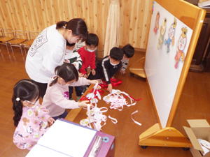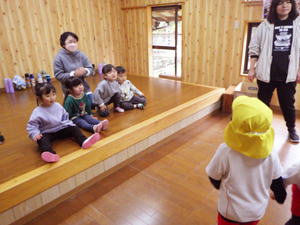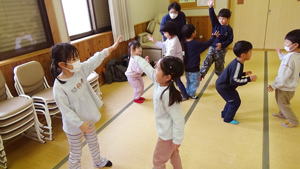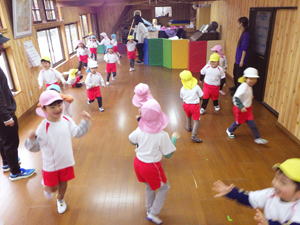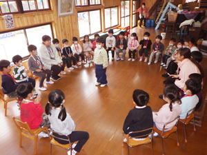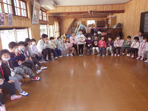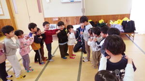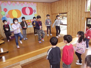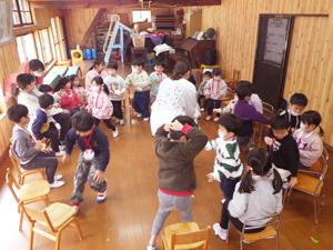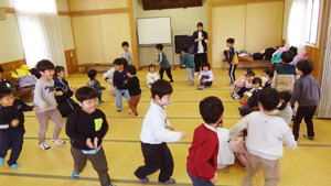| 【3月4日 お楽しみ会】 今月はお誕生日さんがおりませんで、 『お楽しみ会』として行なわれたこの集会。 担当は僕でした。 「さて、どう企画したものか?」 と思いながらプログラムを考えたのですが、 この日はこの後『ひなまつり撮影会』 があると言うことで、 「やっぱりひなまつり!」とその路線で プロデュースすることにいたしました。 そうは言っても先生達のように『芸達者』ではない僕。 自分に出来るものは限られているので、 やっぱりアンパンマンとギター頼みの プログラムとなりました。 最初は『おひなさま、わたしはだあれ?』。 アンパンマンガールズにおひなさまになってもらい、 そのシルエットから「わたしはだあれ?」 と当てるパネルシアターです。 『これは難しいでしょ』と思いながら 投げ掛けたクイズだったのでありますが、 一目で正解を当てちゃった子ども達。 準備していたヒントも出す前の正解だったので 「この子達、すごい!」と思うと共に、 「とほほ・・・」の僕でありました。 とは言いながらありがたいことに まだ分からない子達もあったので、 ヒントのやり取りのくだりも楽めたこのパネルクイズ。 なんとか4人のおひなさまを 紹介出来たのでありました。 このクイズは導入です。 最後のフルーツバスケットの為に 『あかちゃんマン』『メロンパンナちゃん』『コキンちゃん』『ドキンちゃん』 の4人のおひなさま・4つのチーム分かれます。 この4種類の『おひなさまメダル』を準備して来た僕。 「欲しいメダル、取りに来て!」 と声をかけると 嬉しそうに前にやって来た子ども達。 たんぽぽさんから順に好き好きに メダルを選んでそれによって チーム分けが出来たのでありました。 続きまして『イントロクイズ大会』と銘打って、 この一年で歌ったり踊ったりして来た曲を みんなで思い出す時を持ちました。 今歌っている卒園式の歌から始まって、 運動会の体操の曲までさかのぼって行ったこのクイズ。 僕のたどたどしいリードギターで奏でられた イントロを聞いて答えを考えてくれた子ども達でありました。 こちらはイントロと言うのが難しかったのか、 はたまた僕の演奏がへた過ぎたのか、 なかなか正解が出て来ません。 そこで4つに分かれたチームのことを思い出し、 「チームで相談していいよ」と投げ掛けた僕。 するとわらわらとチームの子達が集まって 相談したその結果、 正解が出て来たのでありました。 この流れから急遽チーム対抗戦となった この『イントロクイズ大会』。 設問もちょうど4つありまして、 それぞれのチームがひとつずつ正解を出す そんなめでたしの結果となって、 みんなで喜び合ったものでした。 ひとつひとつ正解が出た後で、 その歌をみんなで大合唱。 「よくわかったね」と言うばらさんのクリスマスソングや、 「この間やったばかりでしょ!」と思うほど正解が出なかった ももさんの発表会の曲などなど、 この一年を振り返ってみんなで歌った 大盛り上がりのイントロクイズ大会となりました。 最後の曲とした『ディズニー体操』は 準備運動につなげまして、 久しぶりにみんなみんなで踊りました。 その際に「運動会の時に前でやった人…」と口に出すと そそくさ前に集まって来たすみれさん。 「これは私達のお役です」 と言わんばかりに 往年のダンスを元気に踊り、 みんなをリードしてくれたのでありました。 さてさて、いよいよお待ちかねの『アンパンマンバスケット』。 4人のおひなさまをキーワードに フルーツバスケットをやりました。 秋の『ハロウィンバスケット』以来でありましょうか、 忘れている子・初めて挑戦する子もありまして 最初は動き出しが微妙だった子ども達。 でもお得意としている大きい子達が 先生と一緒に彼らを上手にリードしてくれて、 みんなで楽くやることが出来ました。 普段はちゃっと動ける子なのに 奥ゆかしいのか・はたまた遠慮深いのか、 空いたイスを前にしながらも 度々鬼になっている子もおりまして、 そんな姿を興味深く見つめたものでした。 そんなこんなで今回はあっと言う間でありましたが、 何とか最後までやり切ったお楽しみ会。 お付き合いしてくれた子ども達に感謝です。 みんなみんな、ありがとう!でした。 |