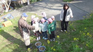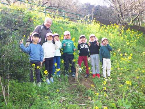 | 【今週のスナップ 3月5日】 今日は卒園記念樹の植樹が行なわれました。 すみれさんと連れ立って、 記念樹を植える丘の上にやって来た髭のおじちゃん。 今年は温州ミカンの木を植えました。 おじちゃんが掘ってくれた穴に苗を置き、 その上から土を被せかけて行った子ども達。 「みかんが生るようになるまでは何年かかかるけど、 その時はまた来てね!」 とおじちゃんとの再会を約束しておりました。 この子達と一緒に大きく元気にすくすく育って、 美味しいミカンが出来ますように。 僕らも神様にお祈りしています。 |