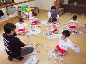 | 5月21日 ばら組 今日はばらさんのお部屋の様子を見て来ました。 まずは礼拝を守る子ども達。 「とても落ち着いたなぁ」 と思いながら、 上手にお祈りをし讃美歌も謳っている この子達のことを見つめた僕でありました。 この日は朝からの雨ふりで 大好きなお外遊びが出来なかった子ども達。 そんなこの子達の想いを汲んでえりか先生。 お部屋で出来る『やんちゃ遊び』をやらしてくれました。 いつも「散らかしちゃダメ!」 「むちゃくちゃしたらダメ!」 と言われて育って来たであろう現代っ子。 それは目の前で子どもがそんなことを始めたら、 『そう言わなくてはいけない』と思うのが親心。 でも状況や目的をちゃんと分かり伝えた上で こんな「やっちゃおう!」で遊ぶことも出来たなら、 それはそれで嬉し楽しい共通体験となるのです。 『新聞紙を細かくちぎって遊ぼう』 と言うこのプロジェクト。 ただただ無茶苦茶やるのではなく 『細かく』とか『細く』って課題を提示することによって、 遊びの中で指先や頭を使いながら 認識や運動の分化を促す大切な学びの場になるのです。 当の子ども達は最初「いいの?」って顔で疑心暗鬼。 でもえりか先生が自分から嬉しそうにビリビリやって見せるので、 子ども達も乗って来ましてビリビリビリ。 そう、子ども達の想いに寄り添って 自らの想いも子ども達に投げ掛けてくれる先生の姿。 その姿に子ども達は心を開いてくれるようになるのです。 ビリビリが出来たら おめでとう!のハッピーシャワーで 面白マックスになっちゃった子ども達。 この後また大いに盛り上がり 雨の日に消化不良になりがちな 心と体力の大発散を楽しんでくれておりました。 最初はそうでも…って感じだった子達も 最後はみんなみんな大はしゃぎ。 嬉しそうな顔を見せてくれたのが嬉しいことでした。 最後はちゃんとお片付けもしました、この子達。 それとお父さんがまだ読んでいない新聞は ビリビリビリってしないでね。 そんなTPOがあるってことを知るのも大切なお勉強。 こんな楽しいことを時々やっちゃいながら、 でのその中にもルールがあることも学びながら、 自分の心と体を思いっきり 伸ばして行って欲しいと思っています。 |