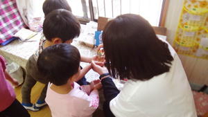 | 【今週のスナップ 5月14日】 今日は今年最初のクッキングが行なわれました。 今年も今回は『ライスカップパフェ』に挑戦してみました。 カップにご飯を入れて、その上に自分の好きな具材を重ねてゆきます。 子ども達に「どれがいい?」と一人一人ひとつひとつ聞きながら、 フルカスタムの一品が出来上がり。 子ども達も『好きなものだけ!』『綺麗な見栄えが良い』 とそれぞれにこだわる所が違うようで、 どれもオリジナリティーあふれた 美味しそうなパフェが出来ておりました。 「トマトが好き!」「枝豆!」と言う子達は カラフルなイロドリのパフェが出来ていたし、 『ガッツリ系』が好みの子達は茶色いド迫力のコッテリパフェ。 それぞれに嬉しそうに食べている子ども達の顔が 実に印象的でありました。 『可愛いカップご飯』と思っていたら 2杯も3杯も「おかわり!」と言うこの子達。 炊飯ジャー2台分のお米をぺろりと完食してしまい、 先生達もビックリしておりました。 こうやって自分で作って食べる嬉しさや美味しさを 感じてもらった今回のクッキング。 ここからこの子達の食の世界がぐんぐん広がって行ってくれたなら、 それは本当に嬉しいことです。 『食わず嫌い』な所も多分にあるこの子達が、 自分の好きなものや食べられるものの世界を 拡大してくれたらそれがなによりのこと。 この体験を通じてこの子達がクッキング・ ひいては食べることに興味を持ち、 食べ物に関心・そして作ってもらっていることへの感謝の想いを 感じてくれるようになってくれたなら、 嬉しく思う僕なのです。 そんなクッキングのために準備・立案してくれている先生達に 心より感謝です。 |