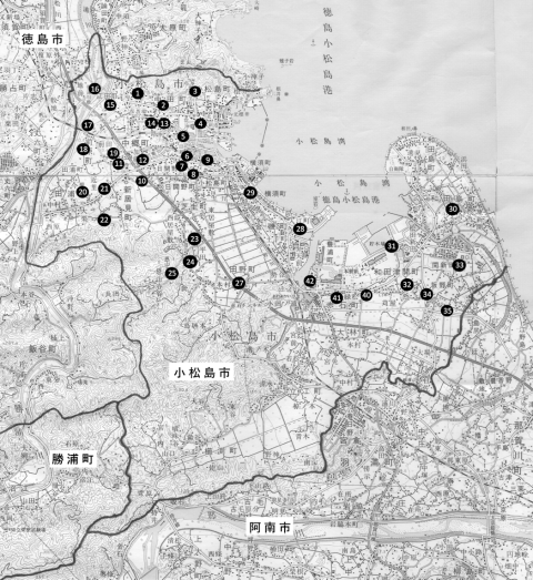 | 小松島市は徳島県東側に位置し、市の中心地は小松島港付近であり、市役所や図書館などが位置する。かつては関西から四国への玄関口として港を中心に栄えていたが、本四架橋の影響から航路撤退が相次いだこと、などで徐々に衰退した。2006年頃に本格的な中心市街地活性化のため、撤退した工場跡地に徳島赤十字病院を核とした複合ビルが完成、「医療福祉都市」へと変わろうとしている。また古くは屋島に逃れた平氏を討つために源義経が上陸したという事や、阿波狸合戦、金長狸民話などでも知られている。 1951年市制施行 人口33170人/2025年 (以上ウィキペディアによる) この調査は「小松島市新風土記」(小松島市新風土記編纂委員会編・2001)に沿って行った。1から29番までは旧小松島地区、30番から48番までは新小松島地区の所在であるが、その内11か所は未訪問である。 |