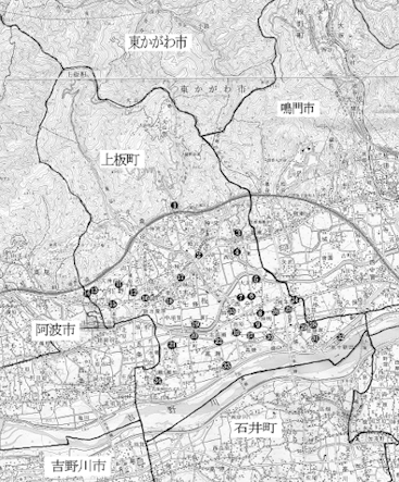 板野郡上板町の地神さんは計35例が確認され、その所在地は右図の通りである。 1955年板野郡大山村、松島町及び名西郡高志村が合併して発足した上板町は吉野川北岸に位置し、面積約35km2、人口約12000人である。 阿讃山脈を源流とする宮川内谷川、泉谷川及び大山谷川などの扇状地に立地し、古くは藍染めの原料となるすくもや阿波和三盆糖の産地であり、現在は柿や桃などの果樹や人参、レタス、いちごなど野菜の栽培が盛んである。又松島千本桜は昔からの桜の名所である。 上板町の地神塔の詳細は[2012 板野郡上板町の地神塔 徳島地域文化研究10号]を参照下さい。 |